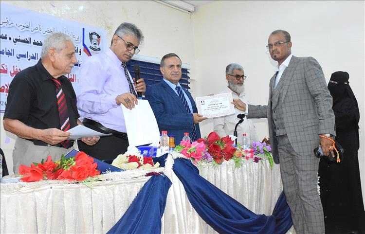 عقب ذلك قام الأخ رئيس جامعة عدن وعميد الكلية ورئيس القسم بتكريم الأساتذة الذين كان لهم دوراً بارزاً في العملية التعليمية، وممن لديهم إصدارات علمية، وممن نالوا ألقاباً علمية رفيعة، والباحثين خريجي الدراسات العليا في برامج الماجستير والدكتوراه.