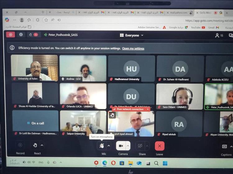 شاركت جامعة عدن يوم الخميس 16 أكتوبر 2025م، في الاجتماع الدوري الافتراضي لشركاء مشروع YHELD الهادف إلى تطوير التعليم العالي، وقد مثل الجامعة في هذا الاجتماع الدكتور/ محمد سالم باعزب مدير عام العلاقات الدولية بجامعة عدن، وممثلها لدى المفوضية الأوروبية.