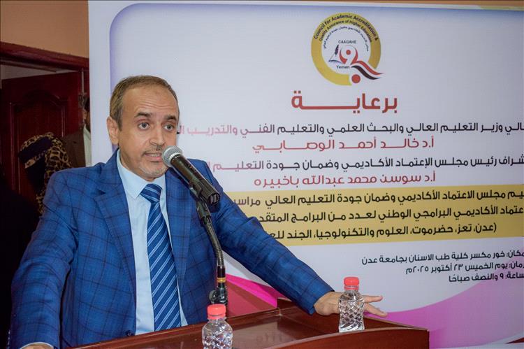 وفي كلمة له عبر رئيس جامعة عدن الأستاذ الدكتور/الخضر ناصر لصور، عن اعتزاز الجامعة بالمشاركة في هذا الحدث الوطني الذي يجسد التوجه الجاد نحو الاعتماد الأكاديمي، مؤكدًا أن جامعة عدن تعد من أعرق الجامعات الوطنية، ومن أوائل المؤسسات التي استوفت متطلبات الترشيح للاعتماد البرامجي، مشيرًا بأن الجامعة تولي الجودة والاعتماد الأكاديمي أهمية استراتيجية ضمن خطتها التطويرية، إدراكًا منها لأهمية مواءمة برامجها مع المعايير العالمية واحتياجات المجتمع وسوق العمل، لافتًا إلى أن الجامعة ماضية في تحديث برامجها ومناهجها الأكاديمية وتعزيز بنيتها التحتية التعليمية، مثمنًا دعم مجلس الاعتماد الأكاديمي ووزارة التعليم العالي في تمكين الجامعات من بلوغ معايير الاعتماد الوطني.