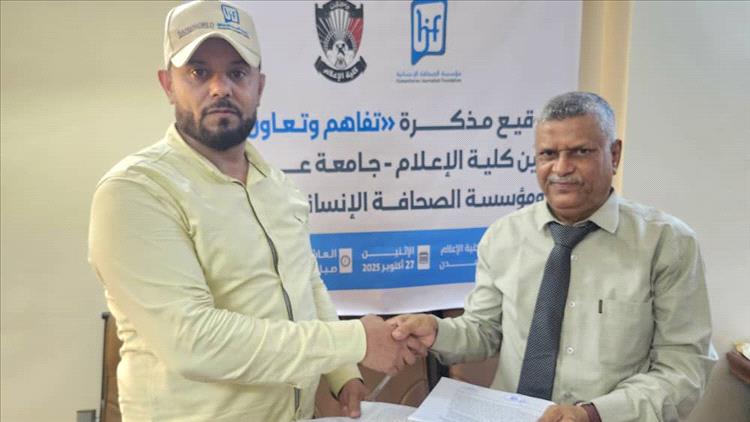 أبرمت كلية الإعلام بجامعة عدن ومؤسسة الصحافة الإنسانية (hjf) اليوم الاثنين الموافق 27 أكتوبر 2025م اتفاقية تعاون مشترك. وقّع الاتفاقية كل من عميد الكلية، الأستاذ الدكتور وهيب مهدي عزيبان، ورئيس المؤسسة، الصحفي بسام القاضي، بهدف إرساء أسس تعاون مثمر يخدم المجتمع ويحقق أهداف التنمية المستدامة.