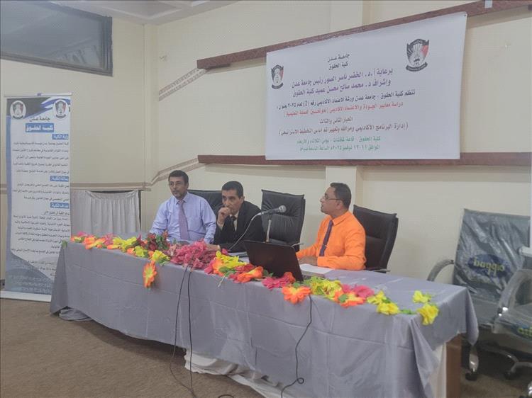بحضور القائم بأعمال رئيس جامعة عدن ونائب رئيس الجامعة لشؤون الطلاب، الأستاذ الدكتور/ محمد عقيل العطاس، وبهدف تعزيز جودة البرامج الأكاديمية وربط معايير الاعتماد الأكاديمي بخطط الكلية الاستراتيجية، نظمت كلية الحقوق صباح اليوم الأربعاء 12 نوفمبر، الورشة الثانية للاعتماد الأكاديمي حول "دراسة معايير الجودة والاعتماد الأكاديمي: إدارة البرنامج الأكاديمي ومرافقه وتجهيزاته أساس التخطيط الاستراتيجي"، والتي استمرت على مدى يومين متتاليين.وتهدف الورشة التي قدمها كل من الدكتور/ منير محمد الصلوي، والدكتور/لؤي طارش نعمان، إلى الربط بين المعيار الأول والثاني، من الرسالة إلى البرنامج، بالإضافة إلى التعريف بالمعايير الثاني والثالث في الاعتماد الأكاديمي، بما يسهم في تطوير الأداء الأكاديمي وضمان جودة العملية التعليمية بالكلية.وجاءت الورشة في إطار جهود جامعة عدن وحرصها على تعزيز مفاهيم الجودة والاعتماد الأكاديمي، وتزويد الكوادر الأكاديمية بالمعرفة والمهارات اللازمة لتطبيق المعايير الدولية في البرامج الأكاديمية وإعداد خطط استراتيجية متكاملة تسهم في رفع مستوى الأداء التعليمي والبحثي بالجامعة.