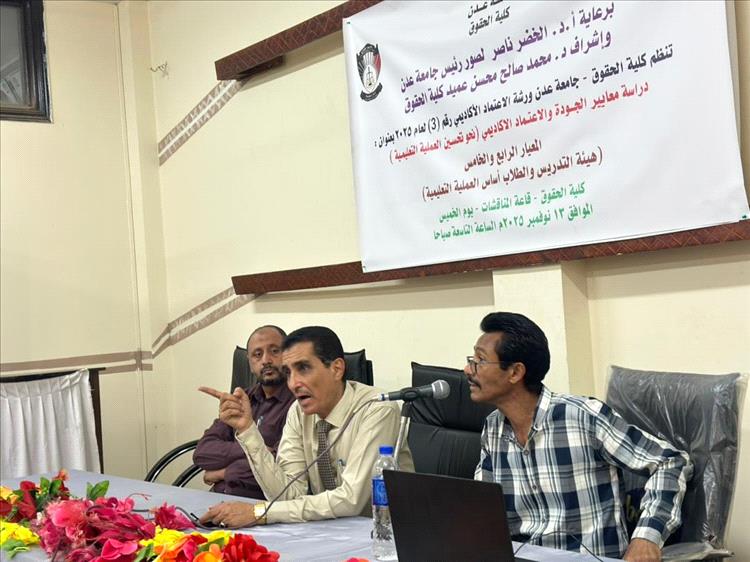 في إطار سلسلة الورش العلمية التي تنفذها كلية الحقوق بجامعة عدن نحو تطبيق معايير الاعتماد الأكاديمي، أقامت الكلية صباح اليوم الخميس 13 نوفمبر، ورشة علمية تدريبية بعنوان: "الطلبة وهيئة التدريس كمعيارين للاعتماد الأكاديمي وضمان الجودة"، برعاية كريمة من رئيس الجامعة الأستاذ الدكتور/الخضر ناصر لصور، وإشراف مباشر من عميد الكلية الدكتور/ محمد صالح محسن.