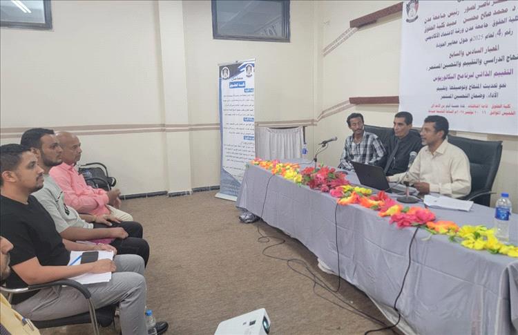 في إطار نهجها التطويري الذي تتبناه للارتقاء بجودة برامجها الأكاديمية، نظمت كلية الحقوق بجامعة عدن، صباح اليوم الاثنين 17 نوفمبر، ورشة علمية تدريبية موسعة بعنوان: "التقييم والتحسين المستمر كمعيار للاعتماد الأكاديمي"، وجاءت هذه الفعالية برعاية كريمة من رئيس الجامعة الأستاذ الدكتور/الخضر ناصر لصور، وبإشراف مباشر من عميد الكلية الأستاذ مشارك الدكتور/محمد صالح محسن، ضمن سلسلة من الأنشطة العلمية التي تهدف إلى تعزيز ثقافة الجودة وتطبيق منهجيات التطوير المستدام داخل الكلية، وشهدت الورشة حضوراً واسعاً ضم عميد الكلية، ونائب العميد لشؤون الطلاب الدكتور/ جهاد باسردة، إلى جانب نخبة من أعضاء هيئة التدريس والطلبة المهتمين بآليات الاعتماد الأكاديمي ومتطلبات تطوير البرامج التعليمية.وقدم الدكتور/منير محمد أحمد الصلوي، خلال الورشة محاضرة ثرية تضمنت شرحاً تفصيلياً لأهمية قياس مخرجات التعلم باعتبارها إحدى الركائز الجوهرية في عملية التقييم المؤسسي، وتناولت المحاضرة الأساليب العلمية الحديثة في جمع البيانات وتحليلها، وكيفية توظيف تلك البيانات في اتخاذ قرارات التطوير الأكاديمي، بما يضمن تحسين جودة العملية التعليمية بشكل مستمر، كما سلطت المحاضرة الضوء على دور التحسين المستمر كمنهجية قائمة على التخطيط والتنفيذ والتقويم، وأثر تبني هذه الثقافة داخل الأقسام العلمية على رفع كفاءة الأداء الأكاديمي وتعزيز قدرة البرامج على المنافسة إقليمياً ودولياً.وتأتي هذه الورشة امتداداً للجهود الكبيرة التي تبذلها عمادة كلية الحقوق استعداداً للحصول على الاعتماد الأكاديمي لبرنامج بكالوريوس القانون، حيث تعمل الكلية على تنفيذ برامج تطويرية متعددة تشمل تدريب الكوادر الأكاديمية، وتحديث الأدلة والإجراءات، وتعزيز جودة المقررات وخططها الدراسية، بما ينسجم مع متطلبات الاعتماد الوطني ومعايير الجودة العالمية، وتؤكد هذه الخطوات توجه الكلية نحو إرساء بيئة تعليمية تلتزم بأعلى معايير الاحترافية، وتقديم مخرجات قادرة على الإسهام الفاعل في سوق العمل.وقد شهدت الورشة أجواء تفاعلية مثمرة، إذ دار نقاش موسع بين المشاركين حول طبيعة المعايير المرتبطة بالاعتماد الأكاديمي، وكيفية مواءمتها مع واقع البرامج الأكاديمية ومتطلبات سوق العمل، وطرحت عديد من الأسئلة والاستفسارات من قبل أعضاء هيئة التدريس والطلبة، الأمر الذي عكس مستوى الوعي والاهتمام المتنامي بأهمية تطبيق معايير الجودة في المؤسسات التعليمية، وأسهمت هذه النقاشات في إثراء محاور الورشة وتبادل الخبرات بين المشاركين، بما يعزز من جاهزية الكلية لمواصلة مسارها نحو الاعتماد الأكاديمي.