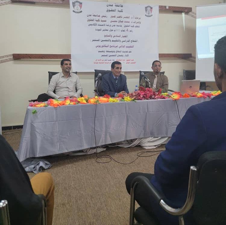 في إطار سلسلة الورش العلمية الهادفة إلى تطبيق معايير الاعتماد الأكاديمي، عقدت كلية الحقوق بجامعة عدن صباح اليوم الخميس 20 نوفمبر، ورشة تفاعلية جمعت أعضاء هيئة التدريس ولجنة الجودة في الكلية، تحت عنوان: "المنهج الدراسي كمعيار للاعتماد الأكاديمي"، والتي جاءت برعاية رئيس الجامعة الأستاذ الدكتور/الخضر ناصر لصور، وبإشراف عميد الكلية الدكتور/محمد صالح محسن، وحضور نائب العميد لشؤون الطلاب الدكتور/جهاد باسردة، إلى جانب نخبة من أعضاء هيئة التدريس.خلال الورشة قدم الدكتور/لؤي طارش نعمان رئيس وحدة الجودة بالكلية، عرضًا تفصيليًا لمحاور اللقاء التي تناولت مفهوم تحديث المساق وأهميته، بالإضافة إلى ارتباطه المباشر بمتطلبات الاعتماد الأكاديمي، وقد شهدت الجلسة تفاعلاً إيجابيًا من جميع الحاضرين، ما أسهم في إثراء النقاشات.وأسفرت الورشة عن إعداد مصفوفة متكاملة للمساقات المُحدثة بعد نقاشات موسعة بين أعضاء هيئة التدريس ولجنة الجودة، حيث جرى تحليل مخرجات التعلم لكل مساق ومراجعة محتواه بما يتوافق مع الاتجاهات الحديثة في التعليم القانوني، كما تمت مقارنة المساقات الجديدة مع الخطط الدراسية في جامعات محلية وإقليمية ودولية، لضمان مواءمتها لأفضل الممارسات الأكاديمية، وحرصت اللجنة على تضمين متطلبات سوق العمل في عملية التحديث، بما يعزز جاهزية خريجي البرنامج وقدرتهم على المنافسة في المجالات القانونية المختلفة.وتأتي هذه الورشة ضمن الجهود المتواصلة التي تبذلها عمادة كلية الحقوق للارتقاء بجودة برنامج البكالوريوس في القانون والسير بخطى ثابتة نحو تحقيق الاعتماد الأكاديمي، حيث شهدت الورشة نقاشات بناءة أكدت التزام الكلية بتطوير منهجها الدراسي بما يلبي المعايير المعتمدة ويواكب التطورات الأكاديمية.