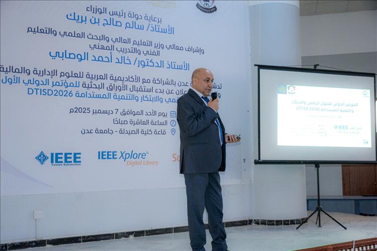 برعاية دولة رئيس الوزراء الأستاذ/سالم صالح بن بريك، وبإشراف وزير التعليم العالي والبحث العلمي والتعليم الفني والتدريب المهني الأستاذ الدكتور/خالد أحمد الوصابي، دشنت جامعة عدن بالشراكة مع الأكاديمية العربية للعلوم الإدارية والمالية والمصرفية، الإعلان عن بدء استقبال الأوراق البحثية للمؤتمر الدولي الأول للتحول الرقمي والابتكار والتنمية المستدامة DTISD2026، المقرر انعقاده في يوليو من العام القادم، وذلك خلال فعالية رسمية احتضنتها كلية الصيدلة بجامعة عدن صباح اليوم الأحد 7 ديسمبر، بحضور وزير الخدمة المدنية والتأمينات الأستاذ الدكتور/عبدالناصر الوالي، ووكلاء وزارة التعليم العالي، ورئيس مجلس الاعتماد الأكاديمي وضمان جودة التعليم العالي، وأعضاء المجلس، وعدد من رؤساء الجامعات اليمنية الأهلية، وعمداء الكليات، ونواب العمداء، وحشد من أعضاء هيئة التدريس والطلاب في الجامعة.