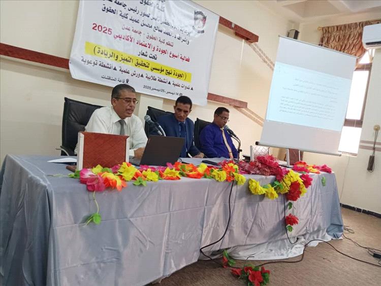 وشهدت الندوة مشاركة واسعة من نواب العميد، ورؤساء الأقسام العلمية، وأعضاء هيئة التدريس، في أجواء علمية تفاعلية عكست الاهتمام الكبير بمحاور الجودة والتطوير الأكاديمي، والتي تأتي ضمن سلسلة من الفعاليات والأنشطة التي تنفذها كلية الحقوق بجامعة عدن خلال أسبوع الجودة العالمي، تأكيدًا على التزامها بتعزيز معايير الجودة والارتقاء بالعملية التعليمية والبحثية.