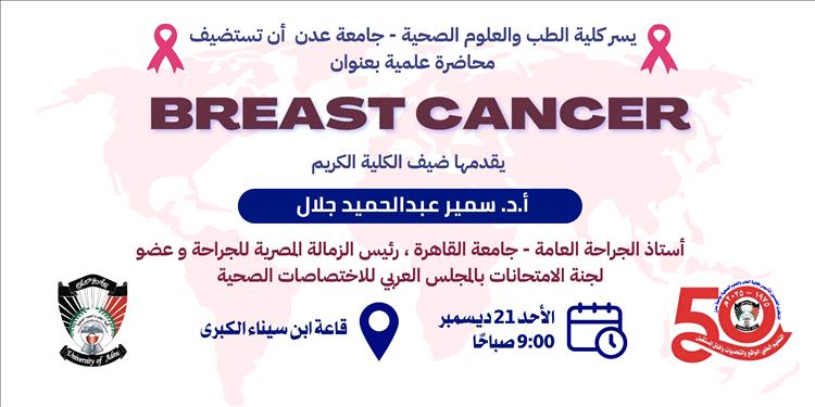 أقيمت يوم أمس الأحد في كلية الطب والعلوم الصحية بجامعة عدن، محاضرة علمية متخصصة حول "سرطان الثدي" “Breast Cancer”، قدّمها الأستاذ الدكتور/سمير عبدالحميد جلال أستاذ الجراحة العامة، ورئيس الزمالة المصرية للجراحة، وعضو لجنة الامتحانات بالمجلس العربي للاختصاصات الصحية، وذلك ضمن الأنشطة العلمية الهادفة إلى تعزيز المعرفة الطبية وتطوير القدرات الأكاديمية والسريرية لمنتسبي الكلية.