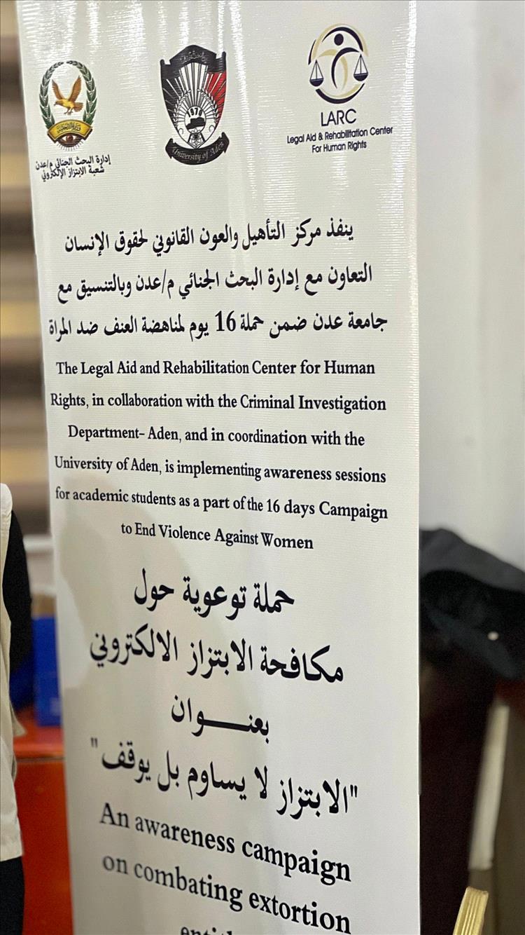وحملت الندوة عنوان: الابتزاز لا يُساوِم.. بل يُوقَف ، ونُفذت من قبل مركز التأهيل والعون القانوني لحقوق الإنسان، وإدارة البحث الجنائي بمحافظة عدن (شعبة الابتزاز الإلكتروني)، بمشاركة نحو 120 طالبًا وطالبة من طلاب كلية اللغات والترجمة.