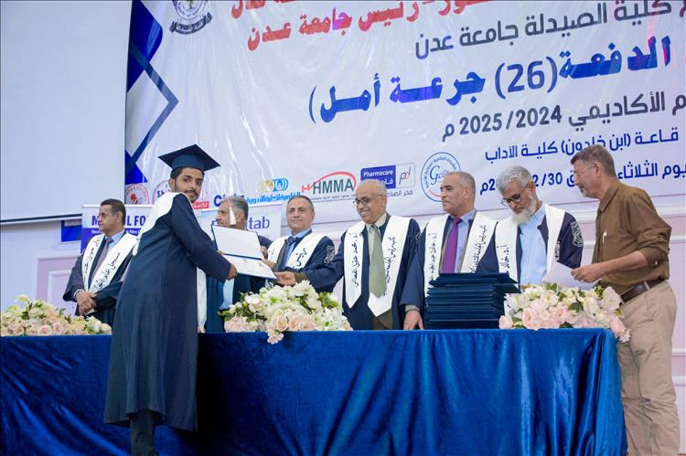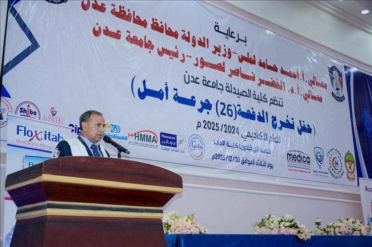 احتضنت قاعة ابن خلدون بكلية الآداب بجامعة عدن، صباح اليوم الثلاثاء 30 ديسمبر، وبرعاية كريمة من وزير الدولة محافظ العاصمة المؤقتة عدن الأستاذ/أحمد حامد لملس، ورئيس جامعة عدن الأستاذ الدكتور/الخضر ناصر لصور، حفل تخرج الدفعة (26) جرعة أمل للعام الجامعي 2024/2025، الذي نظمته كلية الصيدلة بجامعة عدن، في فعالية أكاديمية جسدت اهتمام الجامعة بتكريس تقاليدها العلمية والاحتفائية، وتخلل الحفل تسليم الخريجين شهاداتهم الجامعية كأول دفعة تنال شهاداتها في ذات يوم التخرج، في خطوة تعكس التطور الإداري والأكاديمي الذي تشهده الجامعة.وشهد الحفل حضورًا رسميًا وأكاديميًا واسعًا، تمثل في الأمين العام للمجلس المحلي بمحافظة عدن نائب المحافظ الأستاذ/ بدر معاون، والأستاذ الدكتور/عادل عبدالمجيد علوي العبادي نائب رئيس الجامعة للشؤون الأكاديمية، والأستاذ الدكتور/محمد عقيل العطاس نائب رئيس الجامعة لشؤون الطلاب، والأستاذ الدكتور/محمد عبدالله عقلان نائب رئيس الجامعة لشؤون الدراسات العليا والبحث العلمي، والأستاذ/ محمد حسن سالم أمين عام الجامعة، والدكتور/ لطفي محمد خنبري مدير عام التعليم العالي الأهلي ممثل وزارة التعليم العالي والبحث العلمي والتعليم الفني والتدريب المهني، والدكتور/مراد النشمي مدير فرع الأكاديمية العربية في اليمن، والدكتور/علي ناصر الزامكي مساعد نائب رئيس الجامعة لشؤون الطلاب، والدكتور/رضوان محمد سالم عقيل مسجل عام الجامعة، إلى جانب عمداء عدد من الكليات ومديري المراكز العلمية، ونواب العمداء، ورؤساء الأقسام العلمية، ومديري العموم بالجامعة، وأعضاء هيئة التدريس في كلية الصيدلة، فضلًا عن أولياء أمور الخريجين.وفي كلمته نقل أمين عام المجلس المحلي بمحافظة عدن نائب المحافظ الأستاذ/بدر معاون تحيات وزير الدولة محافظ العاصمة المؤقتة عدن الأستاذ/ أحمد حامد لملس، معبرًا عن سعادته بمشاركته في هذا الحفل الأكاديمي الذي يجسد ثمرة الجهود التي بذلها الخريجون خلال سنوات دراستهم، وأكد أن جامعة عدن تمثل صرحًا علميًا وطنيًا أسهم ولا يزال في إعداد الكفاءات المؤهلة علميًا ومهنيًا في مختلف التخصصات، لا سيما التخصصات الصحية التي تمس حياة المجتمع بشكل مباشر، مشيرًا إلى أن السلطة المحلية بمحافظة عدن تولي التعليم العالي اهتمامًا كبيرًا، وتحرص على دعم أنشطة الجامعة وبرامجها الأكاديمية، مثمنًا الجهود التي تبذلها رئاسة الجامعة وكوادرها الأكاديمية والإدارية في الحفاظ على مستوى الأداء الأكاديمي رغم التحديات، مهنئًا الخريجين وأولياء أمورهم بهذه المناسبة، ومتمنيًا لهم التوفيق والنجاح في مسيرتهم العملية.من جانبه عبر رئيس جامعة عدن الأستاذ الدكتور/الخضر ناصر لصور عن فخره واعتزازه بتخريج الدفعة السادسة والعشرين من كلية الصيدلة، مؤكدًا أن هذا الحدث يمثل محطة أكاديمية مهمة في مسيرة الجامعة، ويعكس حرصها على تطوير العملية التعليمية والارتقاء بمخرجاتها، موضحًا بأن كليات الصيدلة والحقوق واللغات تعد من الكليات المتميزة التي أنجزت شهادات التخرج للعام الجامعي 2024/2025 في وقت قياسي، في دلالة على مستوى الانضباط الإداري والاهتمام بشؤون الطلاب، معبرًا عن شكره وتقديره لعمداء هذه الكليات وكوادرها الأكاديمية والإدارية لحرصهم ومتابعتهم المستمرة لطلابهم حتى تخرجهم، مهنئًا الخريجين بهذا الإنجاز، حاثًا إياهم على التحلي بروح المسؤولية والالتزام المهني، وتسخير معارفهم العلمية في خدمة المجتمع والتنمية.بدوره أوضح عميد كلية الصيدلة الأستاذ الدكتور/خالد سعيد السويدي أن هذه اللحظة تعد محطة مفصلية في مسيرة جامعة عدن وكلية الصيدلة على وجه الخصوص، مؤكدًا أن تنظيم حفل التخرج داخل الحرم الجامعي يمثل تأكيدًا على قدسية الجامعة ودورها الأكاديمي، بعد سنوات من إقامة حفلات التخرج خارج أسوارها، وأشار إلى أن تسليم الخريجين شهاداتهم الجامعية في اليوم ذاته يأتي تتويجًا لجهود كبيرة بذلت خلال الفترة الماضية، ل