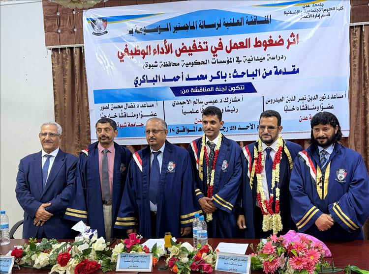 شهدت جامعة عدن صباح اليوم الأحد 18 يناير، حدثاً أكاديمياً نادراً من نوعه، إذ ناقش الأب والابن رسائل ماجستير في قسم إدارة الأعمال بكلية العلوم الاجتماعية والإنسانية، في نفس اليوم للمرة الأولى في تاريخ الجامعة، جاء ذلك بحضور الأستاذ الدكتور/الخضر ناصر لصور رئيس جامعة عدن، والدكتور/عبدالقادر أحمد الباكري المدير التنفيذي للهيئة العليا للأدوية والمستلزمات الطبية، وسط أجواء علمية مميزة تعكس تلاقح الخبرات الأكاديمية والبحثية داخل أسرة واحدة وفي بيئة جامعية واحدة.ففي الجلسة الأولى ناقش الباحث/محمد أحمد عبدالله الباكري رسالته الموسومة بـ "دور العلاقات العامة في إدارة الأزمات: دراسة ميدانية لعينة من شركات النفط بمحافظة شبوة"، ترأس الجلسة أ.مشارك.د/وهيب مهدي عزيبان مشرفاً علمياً، وعضوية كلٍ من أ.مشارك.د/ميسون إبراهيم علي سالم مناقشًا داخليًا، وأ.مساعد.د/نضال محسن لصور مناقشًا خارجيًا من جامعة شبوة.أما في الجلسة الثانية، فقد قدم الباحث/باكر محمد أحمد عبدالله الباكري رسالته التي حملت عنوان "أثر ضغوط العمل في تخفيض الأداء الوظيفي: دراسة ميدانية في المؤسسات الحكومية بمحافظة شبوة"، ترأس الجلسة أ.مشارك.د/عيسى سالم الأحمدي مشرفاً علمياً، وعضوية كلٍ من أ.مساعد.د/نضال محسن لصور مناقشًا خارجيًا من جامعة شبوة، وأ.مساعد.د/نورالدين نصرالدين العيدروس مناقشًا داخلي.في مستهل المناقشتين العلميتين، استعرض الباحثان ملخصين لرسالتيهما، تطرقا من خلالهما إلى المنهجية العلمية التي اتبعاها، إلى بنية الرسالتين من فصول وأبحاث، وكذا التوصيات والاستنتاجات التي خرجا بها، بالإضافة إلى الصعوبات التي واجهتهما أثناء عملية البحث ودراسة الحالة، وقد أقرت لجنتا المناقشة والحُكم قبول الرسالتين، وتم منح الباحثين درجتي الماجستير في إدارة الأعمال من كلية العلوم الاجتماعية والإنسانية، مثمنين الجهود الكبيرة التي بذلها الباحثان ونتائج رسالتيهما التي ستفيد الباحثين والمؤسسات البحثية والمنظمات المختلفة والمكتبات الجامعية.كما حضر المناقشتين عديد من أعضاء الهيئة التدريسية والتدريسية المساعدة في كلية العلوم الإدارية، بالإضافة إلى أقارب وزملاء الباحثين، ما يعكس الاهتمام الكبير بإنجاح المناقشات وضمان أعلى معايير الجودة العلمية.