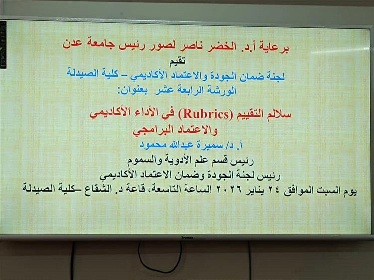 نظمت لجنة ضمان الجودة والاعتماد الأكاديمي بكلية الصيدلة بجامعة عدن، صباح اليوم السبت 24 يناير، الورشة الرابعة عشرة بعنوان "سلالم التقييم (Rubrics) في الأداء الأكاديمي والاعتماد البرامجي"، وذلك برعاية الأستاذ الدكتور/الخضر ناصر لصور رئيس جامعة عدن، بمشاركة واسعة لأعضاء هيئة التدريس والهيئة المساعدة.