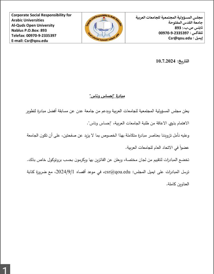 تسلمت رئاسة جامعة عدن رسالة خطية من مجلس المسؤولية المجتمعية عبر الأمانة العامة لاتحاد الجامعات العربية، تعلن من خلالها عن تنظيم مسابقة لأفضل مبادرة لتطوير الاهتمام بذوي الإعاقة من طلبة الجامعات العربية، تحت شعار "إحساس وناس" وذلك بدعم من جامعة عدن.