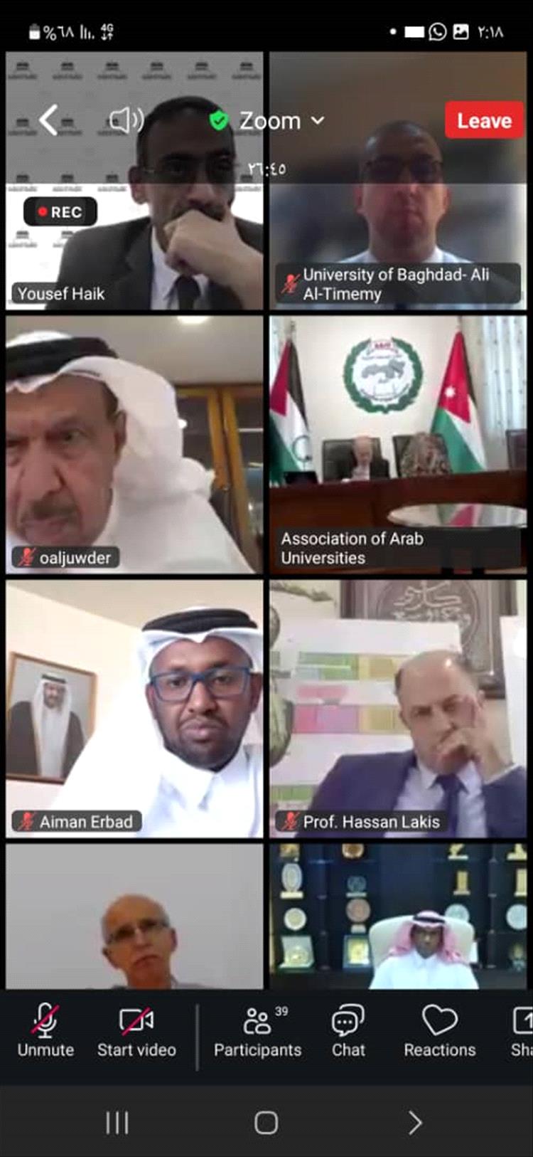 بتكليفٍ من الأستاذ الدكتور/الخضر ناصر لصور رئيس جامعة عدن شارك وفد الجامعة ممثلاً بالأستاذ الدكتور/جمال محمد الجعدني عميد كلية اللغات والترجمة، والدكتور/محمد سالم باعزب مدير عام العلاقات الدولية، والأستاذ الدكتور/عبدالناصر محمد نقيب في اجتماع المجلس التنفيذي لاتحاد الجامعات العربية في دورته (٥٦) للمؤتمر العام الذي عقد اليوم عبر الاتصال المرئي عن بُعد (تطبيق الزوم).